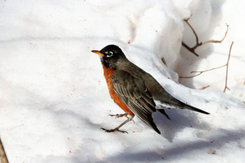 Passerines were either at feeders or along stretches of road where the plows had exposed leaves and grass. The most common species seen were: Blue Jay (36); A Robin (63: see Sheila’s shot of a group in some sumac); and junco (56). We also noted E. Bluebird (9); Tree Sparrow (3); Song Sparrow (2); and White-throated Sparrow (3).