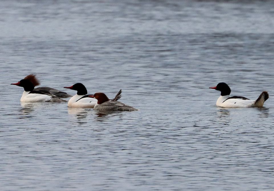 CHAUNCY LAKE (Westboro): Mute Swan (2); Mallard (53); A Black Duck (2); Ring-necked Duck (4); Hooded Merganser (93); Common Merganser (294); Red-breasted Merganser (1f); Bald Eagle (1ad); Red-tailed Hawk (1); Ring-billed Gull (30+: kleptoparasitizing the mergs whenever they fed) Herring Gull (4+).