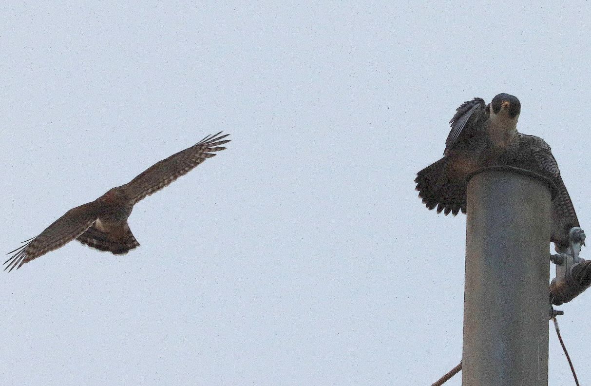 On the way to the IBA, along West Boylston Street, we had a perched Peregrine tearing some prey item apart being attacked by an immature accipiter that we id’d initially as a Cooper’s, then, looking at photos, thought female Sharp-shinned. (see