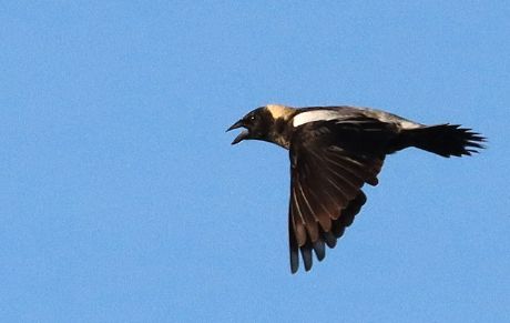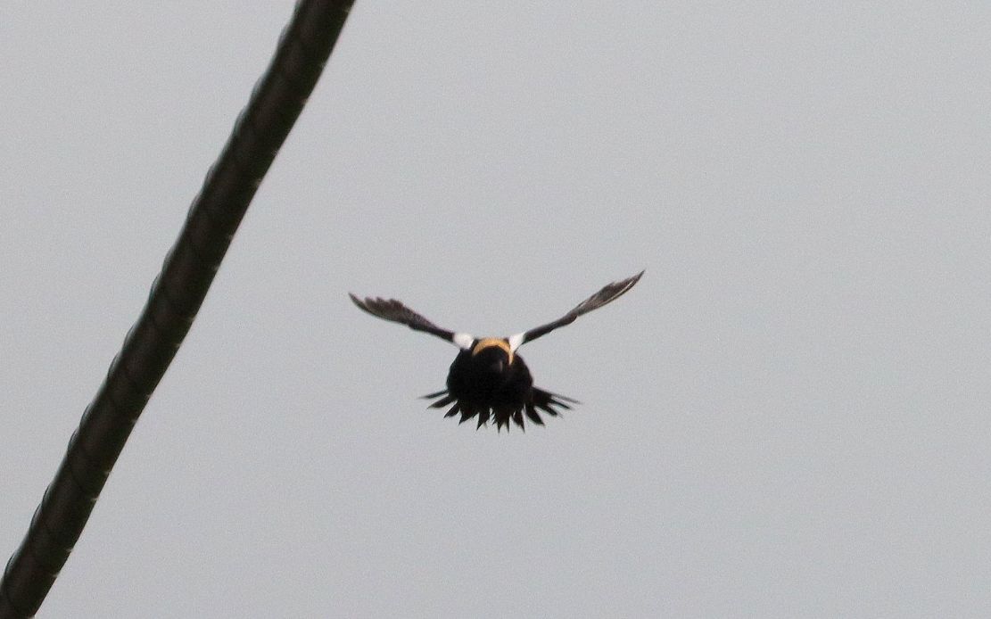Sheila’s shot; she took several) It then left and two other crows that were watching the fish-eating crow flew down and made off with the scraps. I have never seen this behavior of crows before.]