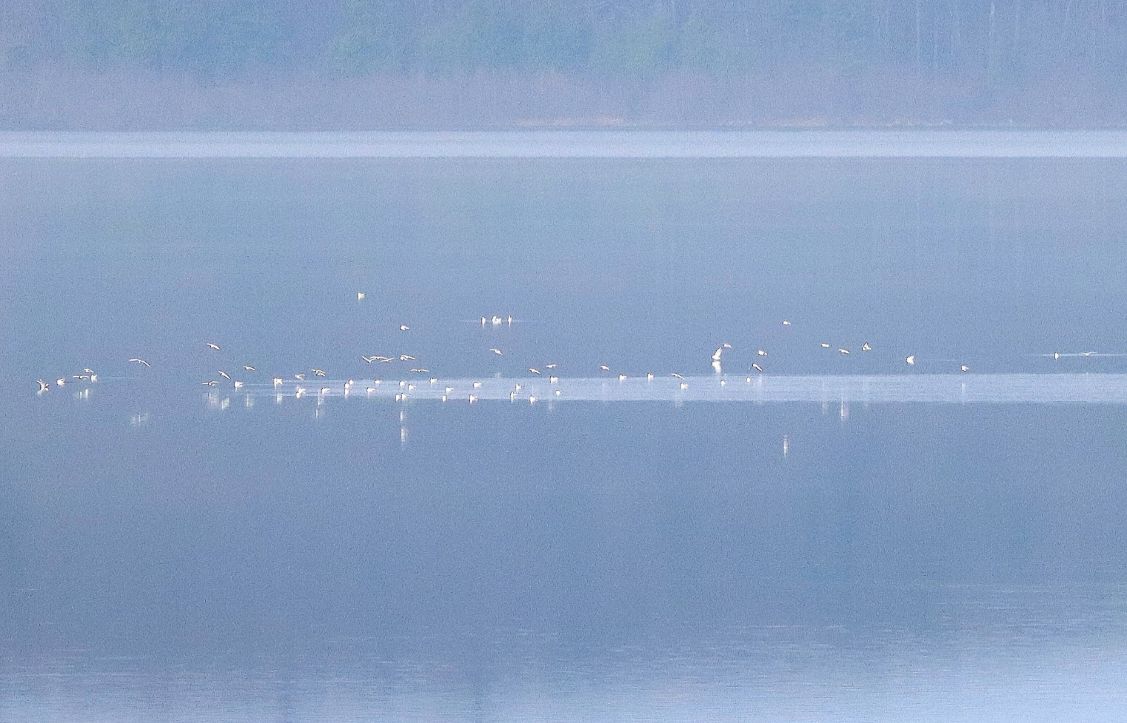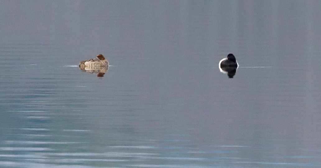 South Bay, Wachusett Reservoir (Gate 17 north near MassWildlife office) was glassy. We saw 6 Common Mergansers, another loon, blue jay, 2 hooded mergansers, mockingbird, 36 Common Goldeneyes and 40 Greater Scaup. The light was fantastic, showcasing the green iridescense on the Scaup. Goldeneyes were throwing their heads back.
