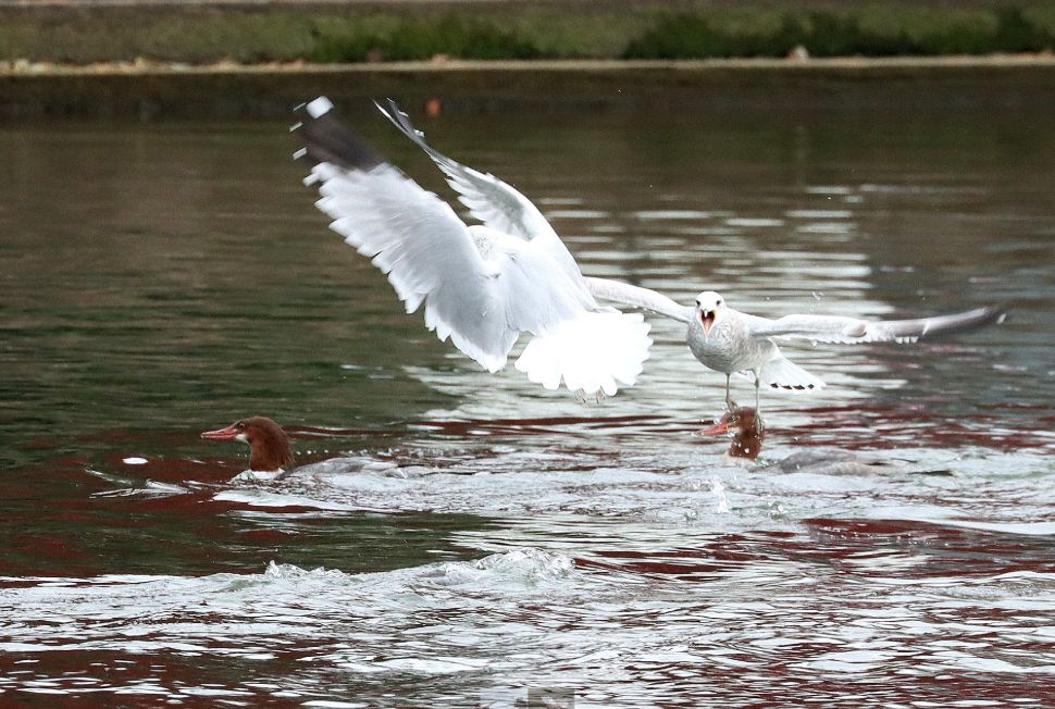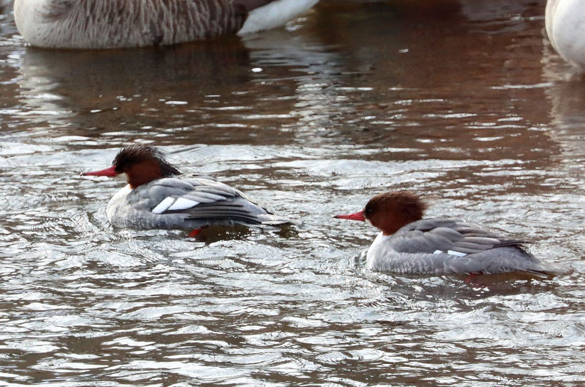NEWTON POND (Shrewsbury): Mute Swan (2); Hooded Merganser (28); Ring-billed Gull (1: kleptoparasitizing the mergs).