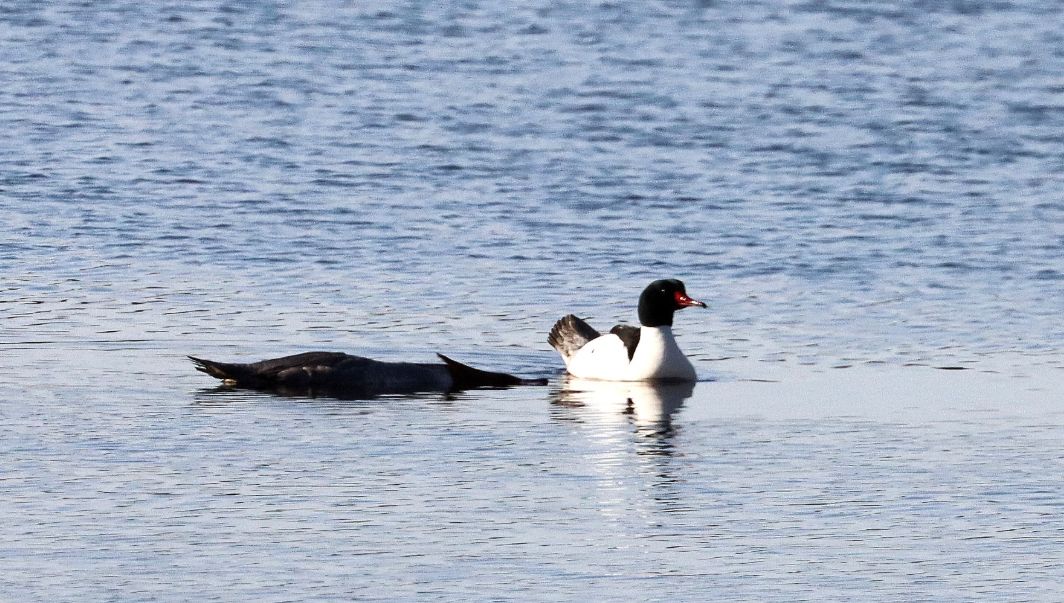 NB: We first birded the north end of Lake Wickaboag. There were scattered small groups of Ring-billed Gulls, small groups of Hooded Mergs and teal. There were no Common Mergansers or the Canvasback. We headed to the Wickaboag beach and saw more Hoodies, gulls, and Mallards , but no Common Mergs or the Canvasback. We even headed over to the western shore and still did not see the Common Mergs or the Canvasback. We left to bird other spots. Hours later we returned to the north end of Wickaboag because over the years we have found that the Common Mergs often head into the middle part of lake, unobservable from any of the usual overlooks. This is the narrowest part of the lake. Sure enough, when we scoped south (from the north end pull-off) there were the Common Mergansers AND the Canvasback. My advice is that if you don’t find the Common Mergs, bird other areas and come back to the north end and try again.