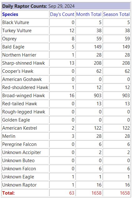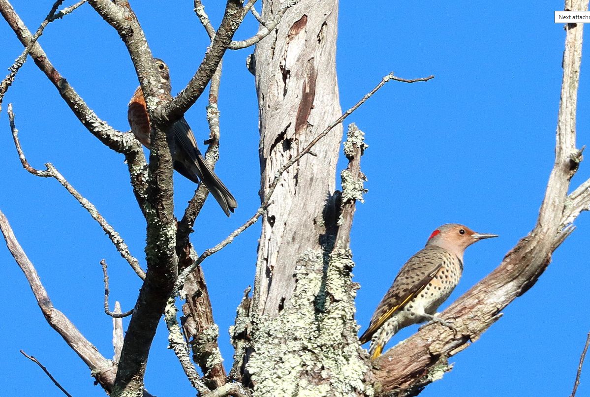 Canada Goose (17); Mallard (10); Hooded Merganser (1); Common Merganser (7); Cooper's Hawk (1); Red-shouldered Hawk (1); Red-tailed Hawk (8);Mourning Dove (5); Belted Kingfisher (1); Red-bellied Woodpecker (6); Yellow-bellied Sapsucker (1); Downy Woodpecker (6); Hairy Woodpecker (1); N Flicker (2).